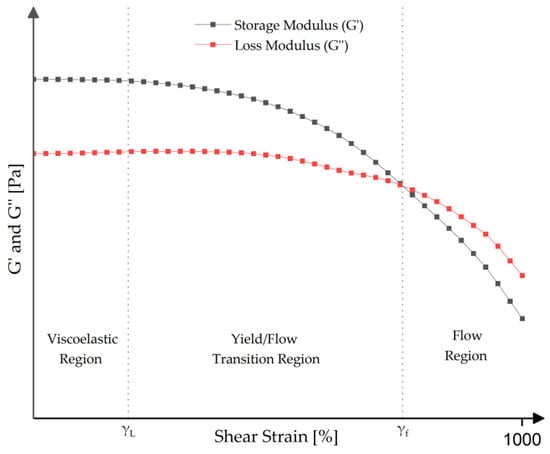 The tests were carried out in a controlled environment, with a logarithmic shear strain ramp from 0.01 to 1000% at a constant angular frequency of 1 Hz. To maintain consistency in sample conditions, a pre-shearing process was instituted for 1 min at a shear rate of 0.05% and frequency of 1 Hz, followed by a 10-minute rest period before measurements. This procedure ensures minimal structural changes, thus providing reliable and repeatable results [14,26].