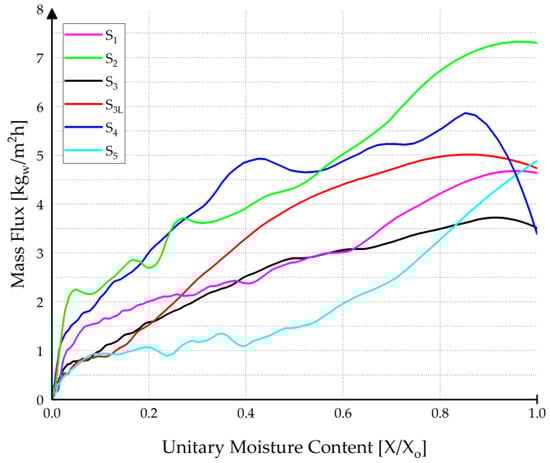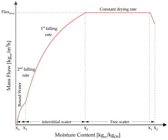 A typical Krischer’s curve (Figure 7) can be segmented into distinct periods. The first period, or the preheating period [Xo–X1], represents a period of adaptation of the sample to the drying conditions. The second period, or the constant-flux period [X1–X2], represents the interval during the supplied heat which serves essentially to evaporate the sludge-free water. The third period, or the first falling-flux period [X2–X3], corresponds to the interval in which the heat serves to evaporate the interstitial water and heat the sludge. The final period, or the a second falling-flux period [X3–X4], corresponds to the end of the drying; in this period, the heat evaporates the bound water [40,41,42,43].