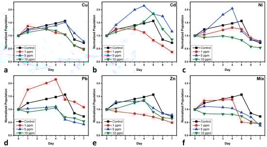 Normalized population growth curves of C. vulgaris cultures after the treatment of (a) copper-MT, (b) cadmium-MT, (c) nickel-MT, (d) lead-MT, (e) zinc-MT, and (f) multi-MT. Normalization is performed at Day 0 of cultivation for minor differences in the initially used biomass. Each value represents the mean of two separate measurements, with each one having an uncertainty of less than 2.5%.