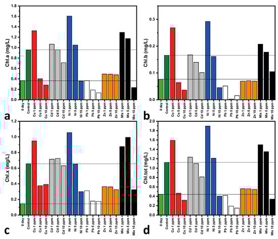 Figure 3 shows the photosynthetic pigment content of all cultures on Days 0 and 7 of cultivation, calculated using Equations (1)–(4). Specifically, the first column bar of each graph represents the pigment levels at Day 0, showing that all cultures begin with the same initial pigment level. The chlorophyll and carotenoid contents of C. vulgaris are significantly affected by exposure to heavy metals [77]. As observed, all calculated pigment concentrations exhibit comparable trends, indicating that any of them can be used to describe pigment behavior under metal exposure. Copper at lower concentrations appears to enhance all the photosynthetic pigment contents under examination due to its role as a cofactor in photosynthetic enzymes [82]. At higher Cu concentrations (5 and 10 ppm), pigment levels decrease, indicating damage to the photosynthesis process [67]. Similar trends, where increasing concentrations reduce the pigment content, are observed for cadmium and lead, with pigment degradation due to metal-induced stress [80]. Nickel enhances pigment synthesis, but higher concentrations are harmful, disrupting essential metabolic pathways [81]. Zinc treatments show a smaller effect on the pigment content due to its role in stabilizing photosynthetic proteins. The multi-MT cultures (Mix) result in a pronounced reduction in pigments, reflecting collective toxicity effects. These findings highlight the dual role of heavy metals as both essential micronutrients and potential toxicants, depending on the heavy metal concentration. The apparent discrepancy between population growth (Figure 1) and the photosynthetic pigment content (Figure 3) in the Ni-treated C. vulgaris cultures results in the varied physiological responses that these parameters represent. While Figure 1 represents total population growth, which includes cellular division and metabolic activity function, Figure 3 represents the content of photosynthetic pigments, which is an indicator of the algal cells’ ability to carry out photosynthesis. For Ni exposure, the high level of photosynthetic pigments in Figure 3 reflects an initial adaptive response where C. vulgaris increases its photosynthetic machinery to overcome nickel-stressed conditions. However, although there is this temporary increase in pigment synthesis, the overall growth of the population in Figure 1 is compromised since nickel still has an inhibitory effect on cell division and metabolic processes in the long term. This highlights the complexity of heavy metal stress in microalgae, with short-term physiological effects, such as increased pigment production, not converting into long-term population increase.