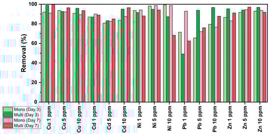The results, as presented in Figure 7, highlight the complex interactions involved in using C. vulgaris to remove heavy metals, particularly the differences between single- and multi-MT cultures. In single-MT conditions, metals like Cu, Ni, and Zn tend to have higher removal rates because they can easily access functional groups on the algal cell wall. However, in multi-MT systems, competition between metals affects adsorption and biosorption, leading to variations in removal efficiency [14]. For Pb, lower removal rates in some cases are likely due to pH constraints. Pb adsorption is most effective at pH 6, but during cultivation, the pH often rises due to photosynthesis [50,85]. This effect is noticeable in single-MT systems at 1 ppm, where Pb removal increased from 71% on Day 3 to 92% by Day 7, indicating strong biosorption over time. In contrast, in multi-MT cultures at 1 ppm, removal was significantly lower (49% on Day 3, increasing to 62% on Day 7), likely due to competition with Cu, Zn, and Ni for binding sites, presenting an antagonistic behavior. At higher concentrations, Pb removal improves significantly (93% of 5 ppm culture and 96% for 10 ppm on Day 3), possibly due to the greater availability of binding sites at elevated metal levels [14].
