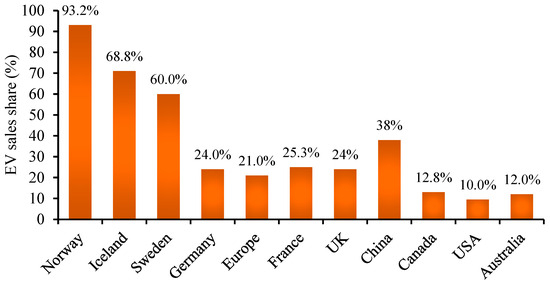 Transportation, another critical sector in the net-zero plan, accounts for almost 21% of Australia’s emissions. Widening the adoption of electric vehicles (EVs) is one of the potential steps to reduce dependency on conventional fuel, accelerate decarbonization, and improve public health, which is reflected in the National Electric Vehicle Strategy [5]. Potentially, RE-based EV charging can provide increased benefits by replacing traditional fuel [6] and promoting RE use and generation. Figure 2 shows the global position of Australia in EV uptake [7] and Figure 3 exhibits the higher consumer preferences for RE application for EV charging based on the data sourced in [8].