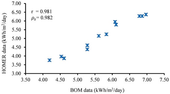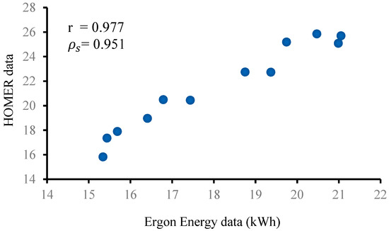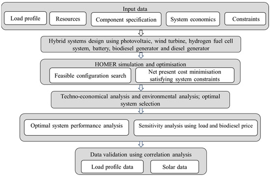 The HOMER analysis is executed encompassing both pre- and post-analysis. Initially, at the pre-HOMER analysis stage, several input data are determined including load profile, resource parameters (PV, wind, temperature, etc.), cost and technical specification of the components, and project constraints. During the HOMER analysis stage, technical feasibility is examined by the simulation of possible configurations. The energy balance of the system is calculated at hourly time step over a year and compared to the corresponding demand. Economic calculations are then conducted if the configuration is deemed feasible [17]. In the optimization process, decision variables, including components’ capacity ((capacity of PV, converter, hydrogen system (FC, electrolyzer and HT), BDG and DG, number of WT and battery)) and dispatch strategy are optimized, minimizing the objective function (net present cost) and complying the constraints (e.g., maximum annual capacity shortage, minimum renewable fraction and operating reserve). The optimization process continues until convergence is achieved in both system design (exercising the precision in the decision variables) and net present cost (satisfying the precision criteria) [36]. Upon obtaining the optimized feasible configurations, these are sorted ascending net present cost, enabling the evaluation of the optimal system. In the post-HOMER stage, the performance of the optimal system is analyzed, and, a sensitivity analysis is conducted to assess the effect of uncertain conditions on the optimal system using multiple values of input parameters (load and biodiesel price). Additionally, the input data used for the load profile and solar resources are validated using a correlation analysis.