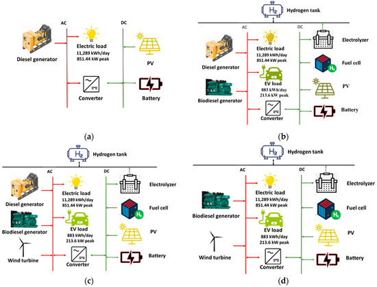 System configurations (a) PV/BESS/DG system (b) PV/BESS/ FC/BDG/DG system (c) PV/BESS/WT/FC/BDG/DG system (d) PV/BESS/WT/FC/BDG system.