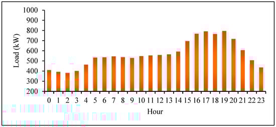 The average daily energy demand of Palm Island is 828.51 kW, with a greater share of residential energy consumption. The average household energy consumption of the island is higher than the average Queensland household, providing an annual residential energy consumption of about 177 MW [39]. In this study, the daily load profile of energy consumption, as shown in Figure 7, is developed based on a residential load of a similar climate region from the HOMER database. The load is matched using the Koeppen-Geiger Climate Classification System with an average daily demand of 470.38 kW to simulate the existing demand. A random variability of 2% in day-to-day and timestep is considered to achieve a more accurate result in load estimation [18].