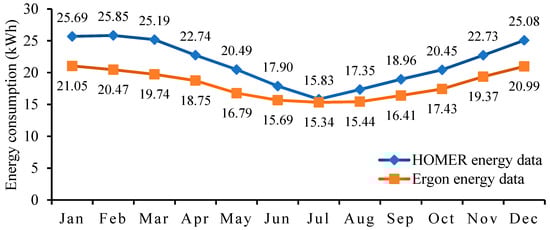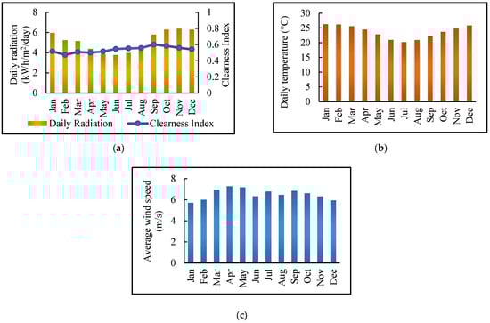 Figure 9c shows the monthly wind resource data based on the climate of the location. The annual average wind speed is obtained as 6.53 m/s. Interestingly, the wind speed is mostly higher during April to August when the solar radiation is comparatively lower. Hence, during this period, the mix of solar and wind resources can complement each other to make the energy system more stable and reliable, realizing the benefits of HRES.