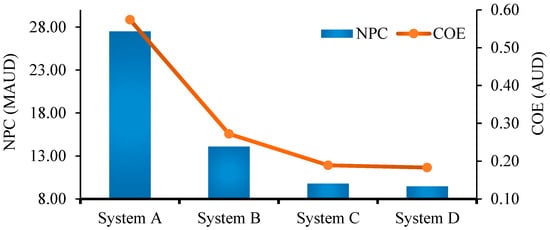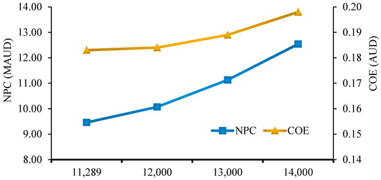Proper sizing of the system components is crucial to ensure cost-effective load supply. This aspect leads to an iterative process of simulation and optimization with varying components’ sizes, following the control strategy and satisfying the system constraints [37]. While the economic parameters, including net present cost and cost of energy, play a crucial role in cost minimization and attainment of an optimal system, HOMER ranks the feasible configurations based on the total net present cost or NPC. This cost refers to the difference between the present value of all the system costs (e.g., installation and operating costs, replacement costs, fuel costs, and others) and all the revenues (e.g., salvage, electricity sales, and others) earned over the project lifetime. In the cost evaluation, NPC is calculated for each system component and for the system itself [36].