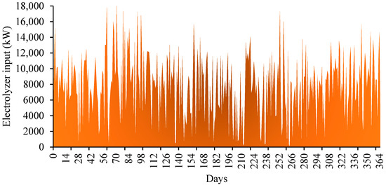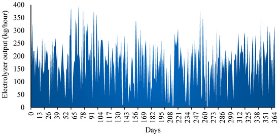 Green hydrogen production through water electrolysis is a carbon-free technology that can be performed through water electrolysis employing an electrolyzer. The electrolyzer uses surplus renewable electricity generated by PV or WT to produce hydrogen following Equation (11) [44]: