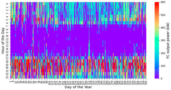The stored hydrogen can be used to generate electricity by a fuel cell, providing a carbon-free technology for electricity generation. It combines hydrogen from the hydrogen tank and oxygen from the air to generate electricity, leaving water as a by-product [46]. The efficiency of the FC is approximated as 60% considering the values of fuel intercept co-efficient and slope as 0.0003 kg/h/kW and 0.05 kg/h/kW, respectively [15]. FC efficiency can be derived in Equation (13) [47] as follows: