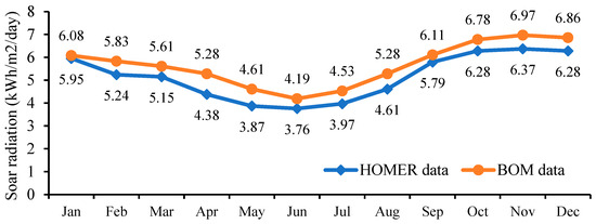The meteorological data, namely solar, temperature, and wind data, are imported from the NASA Surface Meteorology and Solar Energy database from HOMER software. Figure 9a,b present the monthly solar global horizontal irradiance (GHI) and temperature data, respectively. The tropical climate of the island offers mostly warmer months with an average solar radiation of 5.14 kWh/m2/day annually. The highest average radiation is observed during November, offering 6.37 kWh/m2/day, while June offers the lowest radiation, which is 3.76 kWh/m2/day. The annual average temperature of this region is 23.66 °C. The higher temperatures are observed during December to March, while the temperature is lower during June to August.