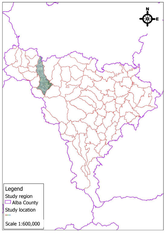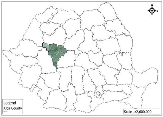 Figure 1 shows the location of the region on the map of Romania, highlighting the geographical position of Alba County, respectively, the investigated area (Figure 2).