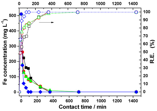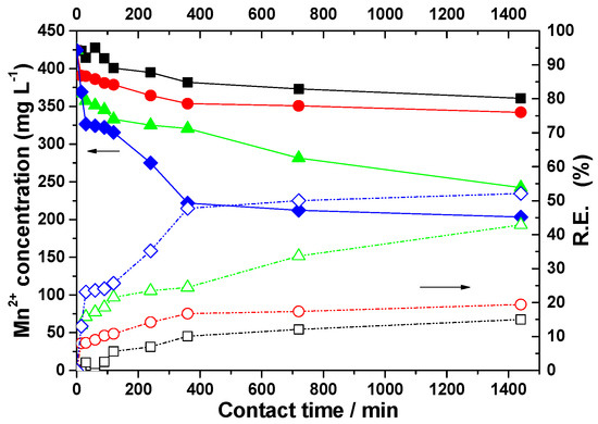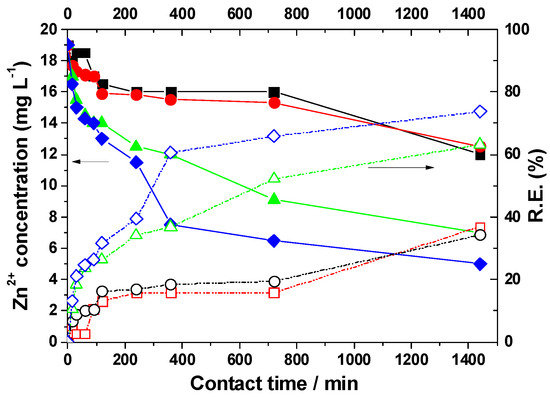 The mechanism of metal ion removal from acidic mine water occurs through ion exchange and adsorption. However, the possibility of iron precipitation in the form of hydroxide should not be excluded, as traces of precipitate have been observed in some cases, especially at long contact times between the zeolite and wastewater [58]. The results indicated that the efficiency of zeolite in retaining Fe, Mn, and Zn ions from acidic mine water is high at the beginning. The lower efficiency at longer contact times may be a consequence of the reduced diffusion of cations into the pores of natural zeolite [59]. Thus, the adsorption/ion exchange process of the investigated metal ions occurs rapidly, especially in the first 120 min, due to the availability of the zeolite’s active sites to participate in the process. The difference between the concentration of metal cations in the acidic mine water and their concentration at the solid–liquid interface is high at the beginning of the experiment, which may also lead to high adsorption rates [60].