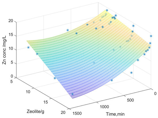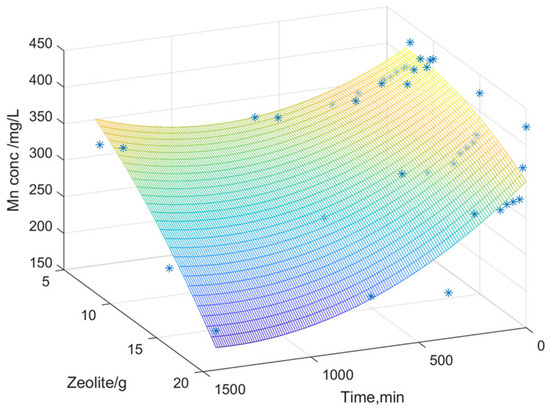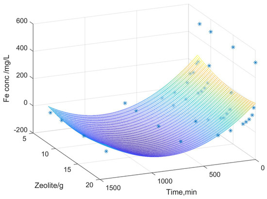 Figure 8, Figure 9 and Figure 10 illustrate the surfaces representing the correlation between the three variables: dissolved metal concentration, applied zeolite dosage, and contact time for adsorption. The surface model was constructed using real experimental data. The graphical representation facilitated the development of a mathematical model to elucidate the relationships between the experimental variables and to identify general trends in the variation in dissolved metal concentrations (Fe, Zn, and Mn).