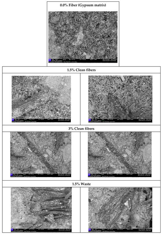 SEM images of the samples obtained with varying clean fiber and waste percentages in gypsum matrix samples.