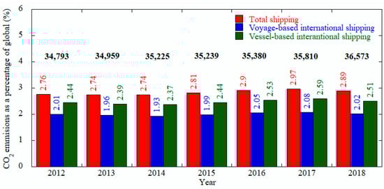 Even though there are data from the year 2012–2017, only later data (2017) was chosen to compare the amount of the various emissions from shipping sector. Among the emissions, CO2 covers the ≈ 96% of the total emissions whereas NOx and, and SOx fill the ≈2.17% and ≈1.12%, respectively. Excess of CO2 not only responsible for climate change but also reduce the pH of sea water and hampers the marine life []. Figure 1 demonstrates the global shipping industries increases the CO2 emission from 2012 to 2018 which shows the necessity of taking IMO GHG strategy [] more seriously. Also, emissions of NOx and other ozone precursor such as NMVOC and CO lead to formation of tropospheric ozone (O3) by photochemical reactions [].