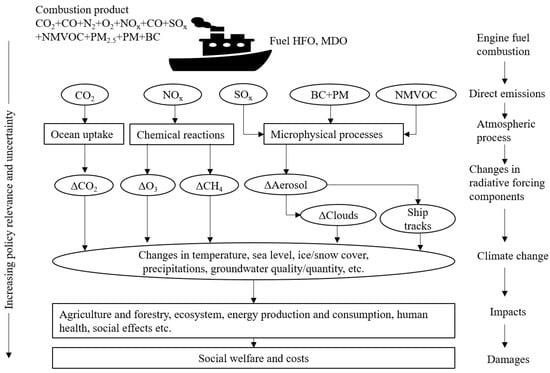 Schematic depicting GHG emission from shipping sector, atmospheric process that is responsible for further changes to radiative forcing components and their impacts on environment, human and social welfare, adapted from [,,,].