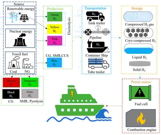 The majority of hydrogen is currently produced from fossil fuels, water, methane (approximately 6%), and coal (approximately 2%) through processes such as steam reforming, electrolysis, biomass conversion, and coal gasification [,,]. H2 produced from renewable energy, unabated fossil fuels and fossil fuels with a combination with carbon capture and storage are referred to as green, grey, and blue hydrogen, respectively []. H2 can be stored physically as compressed gas, cold/cryo-compressed gas, or as a liquid []. Additionally, hydrogen can be stored in solid-state form by physically or chemically bonding with specific hydride materials []; when required, hydrogen can be released through thermal catalysis []. Figure 3 shows the overall technical aspects of H2 in shipping.