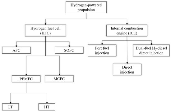 Available hydrogen powered propulsion system for marine vessels, adapted from [,]. AFC—Alkaline Fuel cell, SOFC—Solid Oxide Fuel Cell, PEMFC—Proton Exchange Membrane Fuel Cell, MCFC—Molten Carbonate Fuel Cell, LT—Low Temperature, HT—High Temperature.