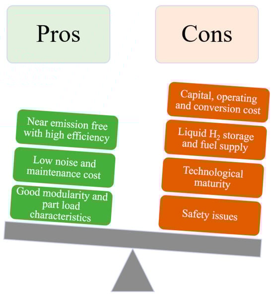Fuel cells have the potential of reaching energy conversion efficiency up to 60% with no acid rain and smog-causing pollutants emissions [,,]. Also, there is little noise due to no moving parts in HFC in addition to better modularity and good part load characteristics unlike diesel engines [,]. In maritime industries, HFC systems have been implemented for main propulsion power and auxiliary power unit (APU) due to its high energy efficiency and C free emission. Nonetheless, at present, fuel cells exhibit a higher cost per kilowatt (kW) compared to internal combustion engines (ICE) [,]. Figure 5 shows the pros and cons of current fuel cell technology.