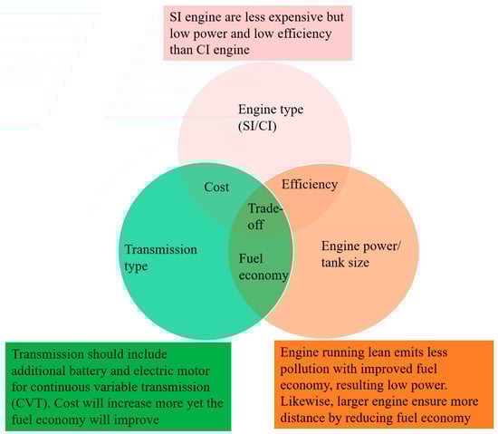 Despite being clean fuel with zero carbon emissions and high specific energy density (almost 3 times than other fossil fuels), several limitation including low density and volumetric energy content (MJ/m3) hinders the H2 to become commercially available for IC engines []. Also, engine modification is needed to facilitate the compressed gaseous H2 unlike the liquid fuels []. In addition to that abnormal combustion characteristics such as high-pressure rise, pre-ignitions, backfire, knocking, and spontaneous ignitions are some of the challenging issues regarding H2ICE [,]. The pre-ignition initiates from the pre-mature ignition of H2 in the several hot spots in engine cylinder due to its low ignition energy while backfire occurs in the opening of the intake valves. To avoid the pre-ignition and backfire problem, a potential solution would be injecting H2 directly into the cylinder in the time of compression stroke [] which is the basis of direct injection (DI). In addition to that DI also possess a very flexible engine operation for optimizing engine performance because of a number of adjustable parameters such as injection pressure, duration, timing and injection orientation []. However, DI is still limited by the high auto ignition temperature of H2 []. Nevertheless, DI H2ICE is an upgrade of the PFI, the efficiency is not up to the mark as the current diesel CI engine. In this regard, Dual-fuel H2-Diesel direct injection (H2DDI) would be a better option where a small amount of diesel pilot fuel is injected as an ignition source into the combustion chamber. This new combustion method for hydrogen internal combustion engines helps reduce knock and enables the engine to operate at a higher compression ratio, enhancing thermal efficiency to levels comparable to modern compression ignition engines []. However, more research is needed to utilize H2DDI as a commercial ICE engine for different applications as the underlying mechanism and effect on engine performance are yet to be fully understood. Currently H2 in H2ICE yields 40% of efficiency []. Figure 6 shows the tradeoffs for utilizing H2 in IC engines.