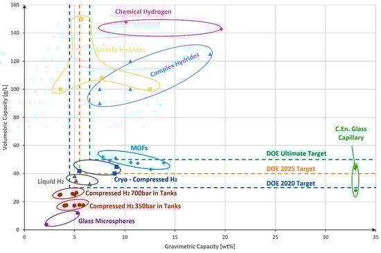 Comparison of various hydrogen storage methods, highlighting their respective gravimetric and volumetric storage capacities, along with the U.S. Department of Energy (DOE) target benchmarks and deadlines: reproduced with permission [,]; 2023 MDPI.