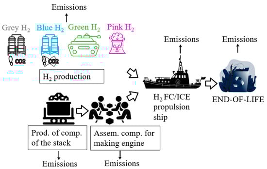 - Fernández-Ríos, A.; Santos, G.; Pinedo, J.; Santos, E.; Ruiz-Salmón, I.; Laso, J.; Lyne, A.; Ortiz, A.; Ortiz, I.; Irabien, Á. Environmental sustainability of alternative marine propulsion technologies powered by hydrogen-a life cycle assessment approach. Sci. Total Environ. 2022, 820, 153189. [Google Scholar] [CrossRef]