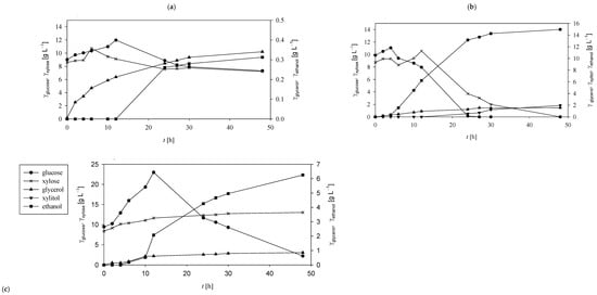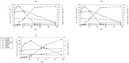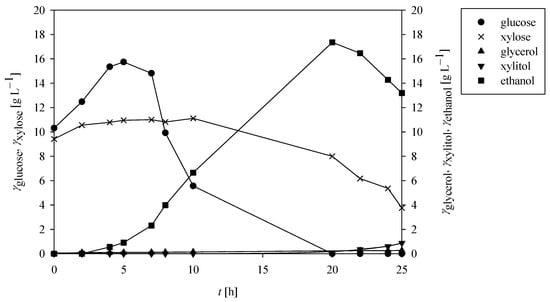 Ethanol production peaked at 22 h, reaching 16.46 g L−1, followed by a gradual decline. In addition to ethanol, minor concentrations of xylitol (0.88 g L−1) and glycerol (0.26 g L−1) were also detected at the end of the bioprocess.