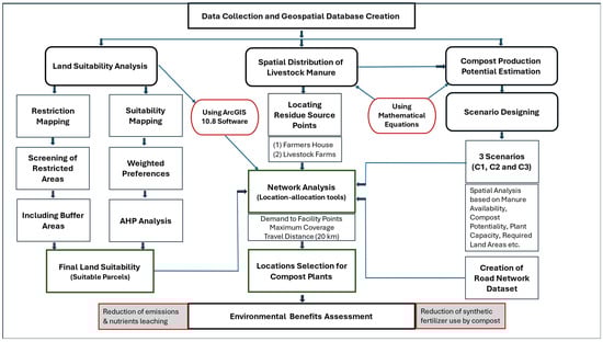 Optimal locations for composting plants were identified based on compost potential from manure, suitable parcel availability, local synthetic fertilizer demand, and maximum coverage of manure sources within a specific range of transportation. Firstly, manure generation and rice straw production were assessed throughout the country to estimate composting potential. To this end, data on factors such as total livestock population by type and rice production were collected from a survey performed by the departments of Livestock Services and Agriculture Extension of Bangladesh in 2024, respectively [,]. After that, suitable parcels were identified through spatial land suitability analysis, and chosen locations for composting plants were optimized using network analysis. This study used several geological, economic, and social factors, such as surface water, transport network, flood-prone area, river erosion area, residential and developed area, etc., during the land suitability and network analysis, and the relevant data were collected from the Bangladesh Bureau of Statistics, the Local Government Engineering Department, the Roads and Highways Department of Bangladesh, and the ArcGIS online websites []. Lastly, some mathematical equations and factors were collected from previous studies for environmental benefit assessment. These collected statistical and mathematically estimated data were processed into a geospatial database (shapefile) using GIS (ArcMap 10.8) software. The methodological framework is shown in Figure 1.