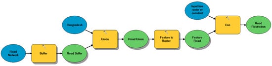 Identifying optimum locations for the development of livestock manure treatment facilities, such as composting plants, is a crucial step. Land suitability analyses using GIS spatial tools aid in choosing appropriate locations for target facilities from various geo-datasets for specific objectives [,]. The exact location can be selected among different possible locations based on the chosen interface between demand points by applying network analysis []. Firstly, this study conducted a spatial land suitability analysis comprising both restriction and suitability modeling to identify suitable parcels from the final land index. Then, the existing road network was evaluated to optimize the sites of composting plants in different scenario analyses in Bangladesh. Lastly, the environmental benefits of various scenarios were projected using mathematical equations and statistics.