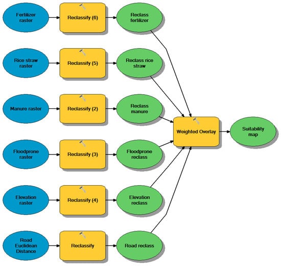 For suitability mapping, six features under three criteria, such as resource availability (livestock manure availability, rice straw availability), economy (distance to road network, demand for synthetic fertilizer), and topography (flood-prone areas, elevation), were considered to optimize plant locations for livestock manure composting across Bangladesh. All features were reclassified according to their appropriateness or suitability for the construction of a new plant. For reclassification, this study used the reclassify tools included in the GIS.