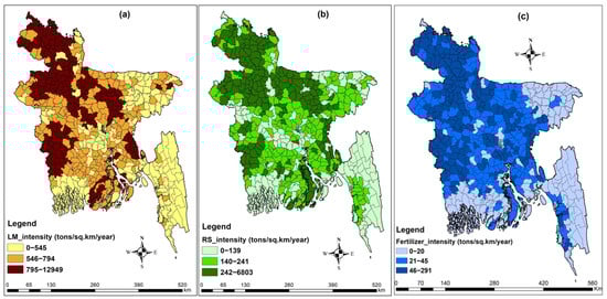 The available manure was estimated by counting the total manure generation from different livestock species in each upazila (an administrative unit of Bangladesh, which acts like a sub-district) using Equation (2) [], and the available rice residues were calculated using Equation (3) [,]. Then, upazila-wise available manure and rice straw amounts were divided by the area of that upazila to determine the manure and rice straw intensity throughout the country: