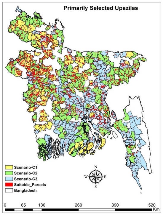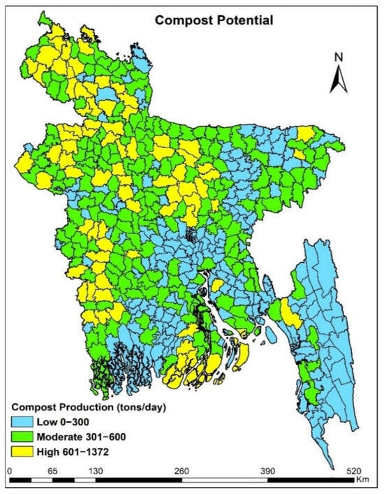 However, previous studies mostly focused on compost composition and techniques for generation from livestock manure, including emissions assessment [,,]. However, there is much less research on the identification of locations for potential compost production, both in the study area and in other parts of the world. Therefore, this study introduces a comprehensive scenario design for establishing large-scale, medium-scale, and small-scale composting plants, which is essential for the sustainable management of livestock manure within Bangladesh.