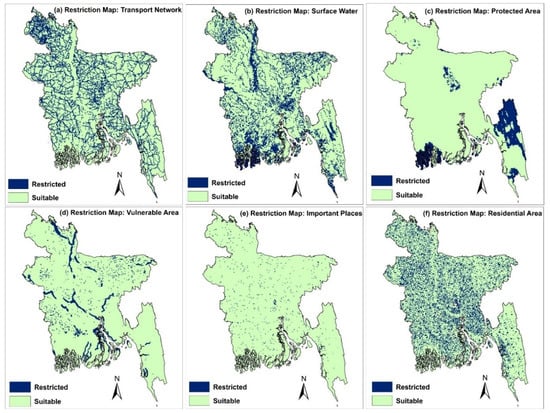 Restriction maps for various restriction features: (a) transport network; (b) surface water; (c) protected area; (d) vulnerable area; (e) important places; and (f) residential area.