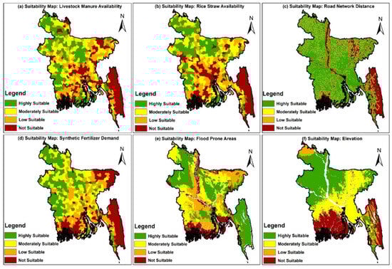 Suitability maps for various suitability features: (a) livestock manure availability; (b) rice straw availability; (c) road network distance; (d) synthetic fertilizer demand; (e) flood-prone area; and (f) elevation.