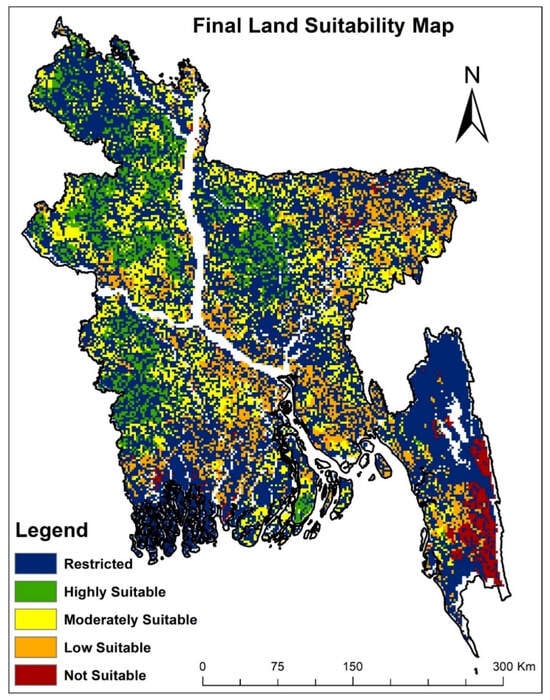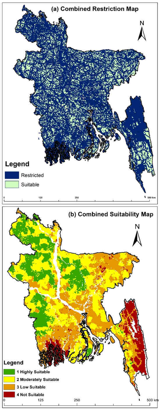 In the restriction modeling, six restricted features were analyzed and excluded from the country map to identify the lands that are applicable for further development (Figure 6a–f). In the case of suitability modeling, the degree of land suitability was analyzed based on six suitability features, and the separate suitability raster maps are shown in Figure 7a–f. After the combination of all the different restricted feature maps, the final restriction map was interpreted (Figure 8a), where the restricted and suitable areas were specified by blue and light green-colored areas, respectively. The separate suitability maps were combined to create the combined suitability map (Figure 8b), where the green, yellow, orange, and red-colored areas are indicated as highly suitable, moderately suitable, low suitable, and not suitable areas for siting composting plants in Bangladesh.