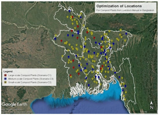 After spatial analysis, approximately 53, 138, and 222 upazilas were selected as primary upazilas for the establishment of large-scale, medium-scale, and small-scale composting plants from livestock manure in Bangladesh, respectively (Figure 10). The red colored areas within the primary selected upazilas are indicated as suitable parcels in the land suitability analysis. However, all the initially selected upazilas lack sufficient suitable parcels for developing composting plants. Similarly, each selected upazila has several suitable parcels for implementing composting plants. Therefore, the optimum sites are identified through network analysis among various candidate locations within the primarily selected upazilas. The results indicate that, in Scenario-C1, 15 large-scale composting plants are feasible considering transport efficiency and manure volume from the total livestock in the selected upazilas (Figure A1a). Additionally, around 42 medium-scale plants could be established to produce compost from available livestock manure within the chosen upazilas in Scenario-C2. (Figure A1b). As the plant capacity of Scenario-C3 was less than medium and large-scale plants, the number of plants was higher than in other scenarios. Around 147 locations were counted as chosen locations among many candidate locations for small-scale compost production in Scenario-C3 from livestock manure in Bangladesh (Figure A1c). Finally, the optimized locations for composting plants in different scenarios across Bangladesh are shown on the Google Earth map (Figure 11).