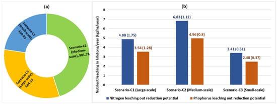 Environmental impacts across different scenarios of composting plants: (a) GHG emissions reduction potential (in gigagrams CO2eq/year); (b) manure nutrients leaching reduction potential (in kilotons/year).