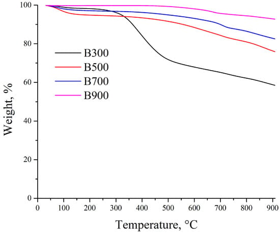 The presented TGA graph shows the dependence of biochar mass change on temperature, produced from wastewater sludge pyrolysis at various temperatures. As the thermal treatment temperature increases, the biochars exhibit different degrees of thermal resistance, which is associated with the removal of volatile substances and the decomposition/mineralization of organic compounds [27]. The most pronounced weight reduction occurs below 500 °C, primarily attributed to volatile components that remain after low-temperature pyrolysis [28]. For biochar produced at 500 °C, the mass loss is less pronounced compared to B300, as the main volatile components have already been removed by this temperature [28]. The mass loss stabilizes above 600 °C, indicating a higher degree of carbonization and structural stability [29]. Biochar produced at higher temperatures (e.g., 700 °C and 900 °C) shows minimal mass loss throughout the heating interval. The high pyrolysis temperature results in maximum material stabilization due to the complete decomposition of organic impurities [29,30]. With increasing pyrolysis temperature (from B300 to B900), the thermal stability of the biochar significantly improves. Biochar produced at 900 °C is characterized by minimal mass loss, indicating its high degree of carbonization and low volatile content. In contrast, materials produced at lower temperatures (B300 and B500) contain more organic and volatile components, which reduce their thermal resistance.