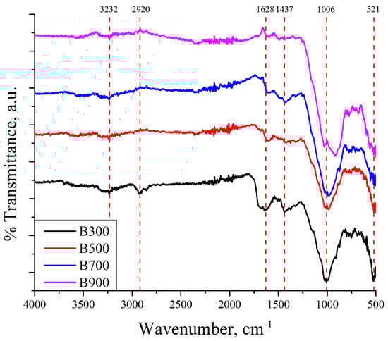 Surface functional groups of biochars obtained at various pyrolysis temperatures were characterized by FTIR spectroscopy, with the results presented in Figure 2.