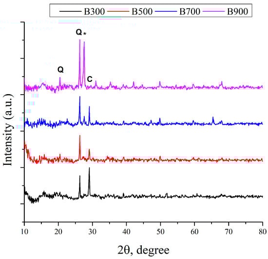 XRD analysis of the biochar samples: a) B300, b) B500, c) B700, and d) B900 (Q—quartz, *—feldspar-type minerals, and C—calcite).