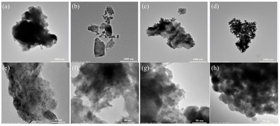 TEM images of biochar samples: (a,e) B300, (b,f) B500, (c,g) B700, and (d,h) B900.
