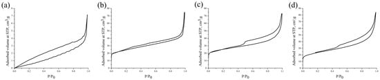 N2 adsorption–desorption isotherms of the biochar samples: (a) B300, (b) B500, (c) B700, and (d) B900.