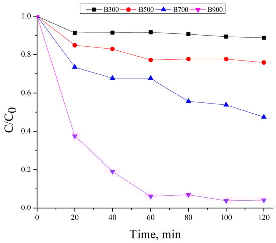 The adsorption capacity of the biochars for methylene blue was assessed during a 120-min period, with the outcomes presented in Figure 7. Experiments were carried out using 500 mg/L of biochar at an initial MB concentration of 10 mg/L in the absence of persulfate. The normalized concentration values (C/C0) indicate a clear dependence on the pyrolysis temperature of the biochar.