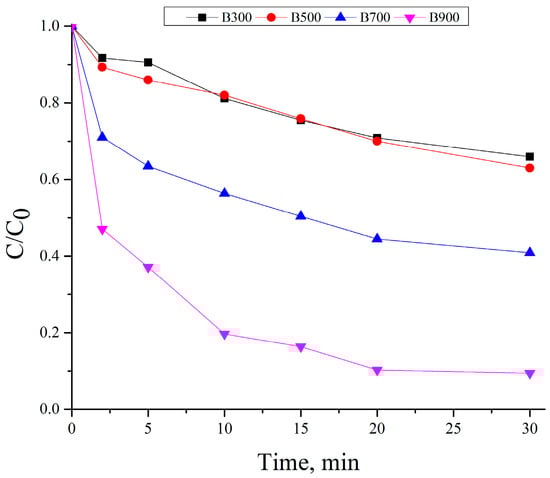 In the case of B300 and B500, only modest improvements were observed. B300 showed a gradual decrease in C/C0 from 1.00 to 0.66 over 30 min, while B500 reached 0.63, reflecting limited surface activity and weak PS activation. In contrast, B700 and especially B900 demonstrated significantly accelerated degradation kinetics. B700 achieved a C/C0 of 0.41 after 30 min, while B900 reduced the MB concentration to just 0.09 in the same time frame. This high efficiency is attributed to the well-developed porous structure, increased surface area, and greater exposure of mineral components such as Fe and Al in B900, which may promote electron transfer and radical generation during persulfate activation [25,49]. The clear difference from the adsorption-only tests indicates that persulfate-driven catalytic oxidation is the dominant pathway for MB degradation, especially in biochars produced at elevated pyrolysis temperatures.