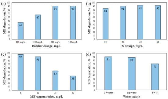 Effects of operational parameters on methylene blue degradation in the biochar/persulfate system after 30 min: (a) effect of biochar dosage (100–700 mg/L); (b) effect of persulfate dosage (10–60 mg/L); (c) effect of initial MB concentration (5–50 mg/L); (d) effect of water matrix (ultrapure water, tap water, and synthetic wastewater (SWW) containing glucose 150 mg/L, Cl− 50 mg/L, HCO3− 200 mg/L, and NO3− 150 mg/L).