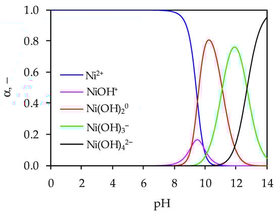According to Figure 1, Ni(II) exists predominantly in the form of Ni2+ up to pH = 8. Then, with increasing pH, hydroxylated Ni(II) products are formed. Thus, a small fraction of Ni(II) in the form of Ni(OH)+ appears at 8.0 < pH < 10.8, with a maximum distribution of 16% at pH = 9.5. Ni(II) starts to precipitate in the form of hydroxide, Ni(OH)20 in the pH range 8.0–13.5 with a maximum content of 80% at pH = 10.2. At pH > 9.5 Ni(II) exists in the anionic form, Ni(OH)3−, with a maximum content of 76% at pH = 11.9, while the proportion of the anionic form Ni(OH)42− increases continuously above pH = 11.