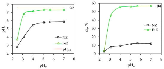 Figure 2a primarily indicates that the measured pHe are lower than the calculated pHppt (pHppt = 7.55 for co(Ni) = 4.266 mmol/L) for both zeolite samples and for all pHo, which excludes the possibility of Ni(OH)2 precipitate formation. Additionally, plots of Ni(II) species vs. pH were constructed using Hydra/Medusa software (https://sites.google.com/site/chemdiagr/download, accessed on 19 August 2025), considering the initial Ni(II) concentration and ionic strength of the solution and are shown in Figures S1 and S2 in the Supplementary File. These results further confirmed that Ni(II) precipitation did not occur under the specified experimental conditions. Comparing the results of pHe vs. pHo (Figure 2a) with αe vs. pHo (Figure 2b), the same trend of change in the measured parameters (pHe and αe) is observed. Thus, for NZ, pHe and αe increase up to pHo = 5, while for FeZ up to pHo = 4. After the specified pHo, there is no change in the measured parameters, i.e., a plateau is established. For both samples, the increase in pHe is most pronounced in the highly acidic medium as a consequence of the competition effect of Ni(II) with H+ ions. Since both zeolites have a negative charge in the tested pHo range, especially FeZ due to the modification, the increase in pHe is more pronounced for FeZ as a result of a more pronounced electrostatic attraction. In a slightly acidic medium, at pHo = 5–7 for NZ and pHo = 4–7 for FeZ, the competitive effect is minimal due to the low concentration of H+ ions. However, in this case, the increase in pHe is primarily a consequence of the decrease in Ni(II) concentration in suspension and the shift of the equilibrium reaction of Ni(II) hydrolysis to the left, as shown by Equation (5). In short, the establishment of a plateau in the range 5 < pHo < 7 for NZ and in the range 4 < pHo < 7 for FeZ corresponds to the optimal pH range since the maximum αe is achieved for the observed initial concentration (12% for NZ and 57% for FeZ). The almost five-fold higher efficiency of Ni(II) removal using FeZ justifies the implementation of zeolite modification.