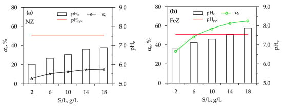 Comparison of pHe with pHppt and removal efficiency, αe, at various S/L ratios for (a) NZ and (b) FeZ.