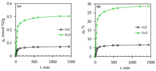 The amount of Ni(II) sorbed on NZ and FeZ and the removal efficiency as a function of time are shown in Figure 4.
