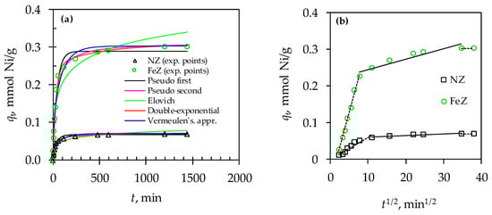 Figure 5 shows a comparison of the kinetic reaction and diffusion model curves with experimental kinetic data of Ni(II) sorption on NZ and FeZ. The calculated parameters of the kinetic models, along with the indicators of agreement, are presented in Table 2.